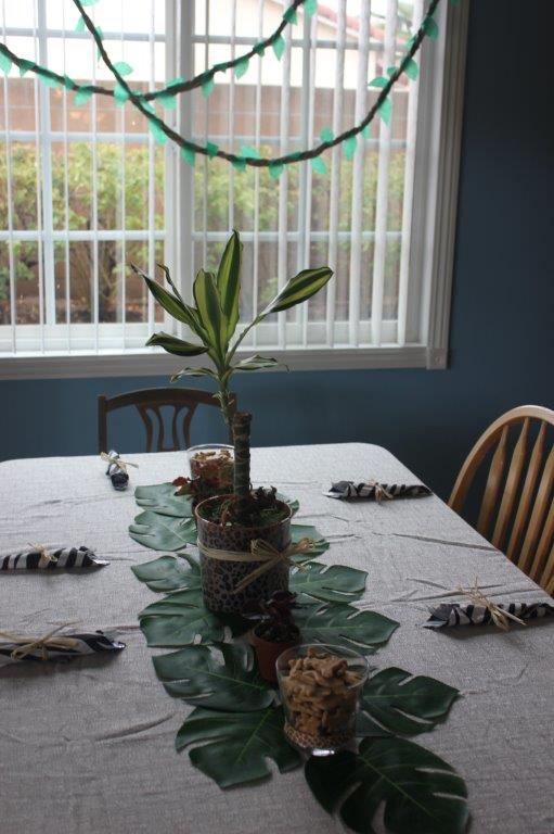 We turned the tv stand and coffee table into our gift area, covering them with a table cloth, decorating it with matching table decor, and hanging jungle medallions.