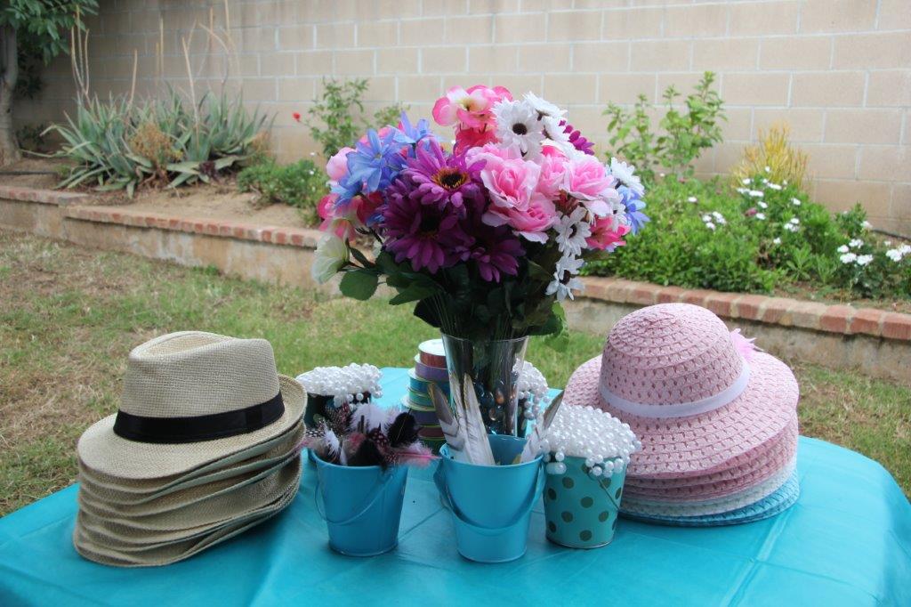 To set-up this table I just bought around 10 bouquets of assorted flowers and ribbons from the Dollar Tree. I also supplied the table with feathers from Hobby Lobby, thinking the boys would not like flowers on their hats. Well they surprised me and the kids mixed and matched everything, we even had a four year old boy sporting a pink sunhat! The boys also loved wearing the faux pearl necklaces I bought off Oriental Trading Company. The girls sun hats also came from Dollar Tree and the boys fedoras came from Ebay.